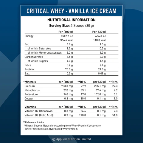 Critical Whey™ Protein has been developed using a unique blend of whey protein concentrate, Whey Protein Isolate & Hydrolysed Whey Protein. Whey Protein Concentrate is produced by ultra-filtration technology containing high levels of protein and branched chain amino acids (BCAAs). Whey Protein Isolate is the highest quality of protein and is produced using cross-flow-micro-filtration. Hydrolysed Whey Protein is a pre-digested protein enzymatically broken down into peptides. These high biological value and easily digested proteins support the growth and maintenance of muscle.¹