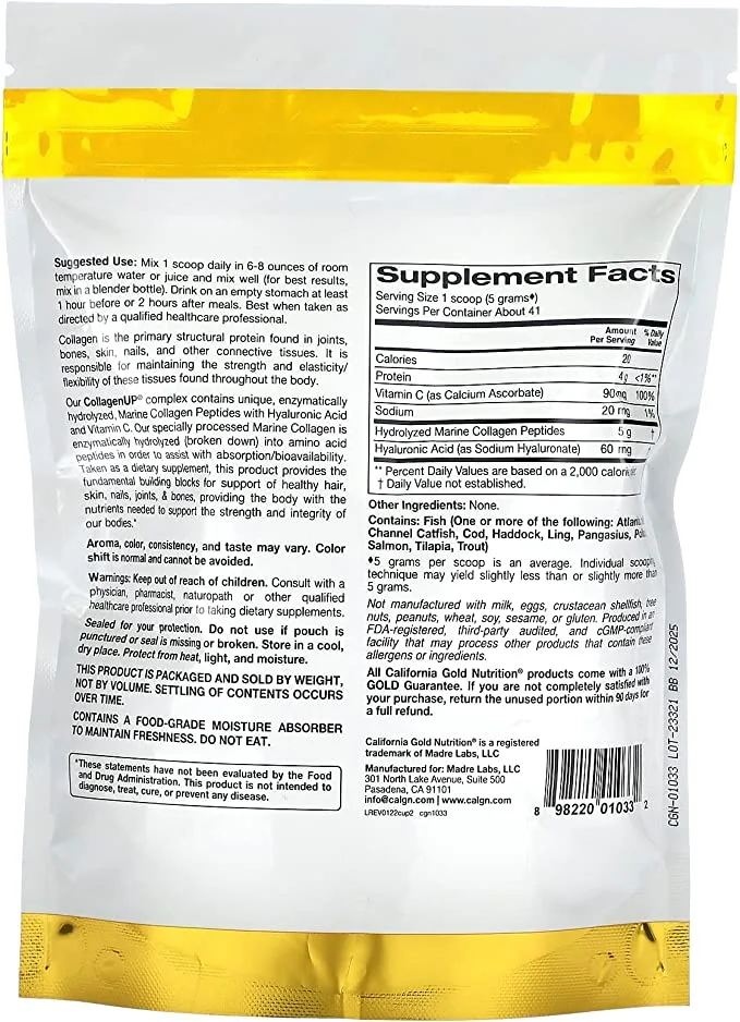 Collagen, hyaluronic acid, and vitamin C all contribute to the health and wellbeing of the musculoskeletal system. California Gold Nutrition CollagenUP contains all three of these ingredients to help support healthy hair, skin, nails, joints, and bones.* The unflavored powder can be quickly added to your favorite drink, providing a convenient way to add collagen to your diet.