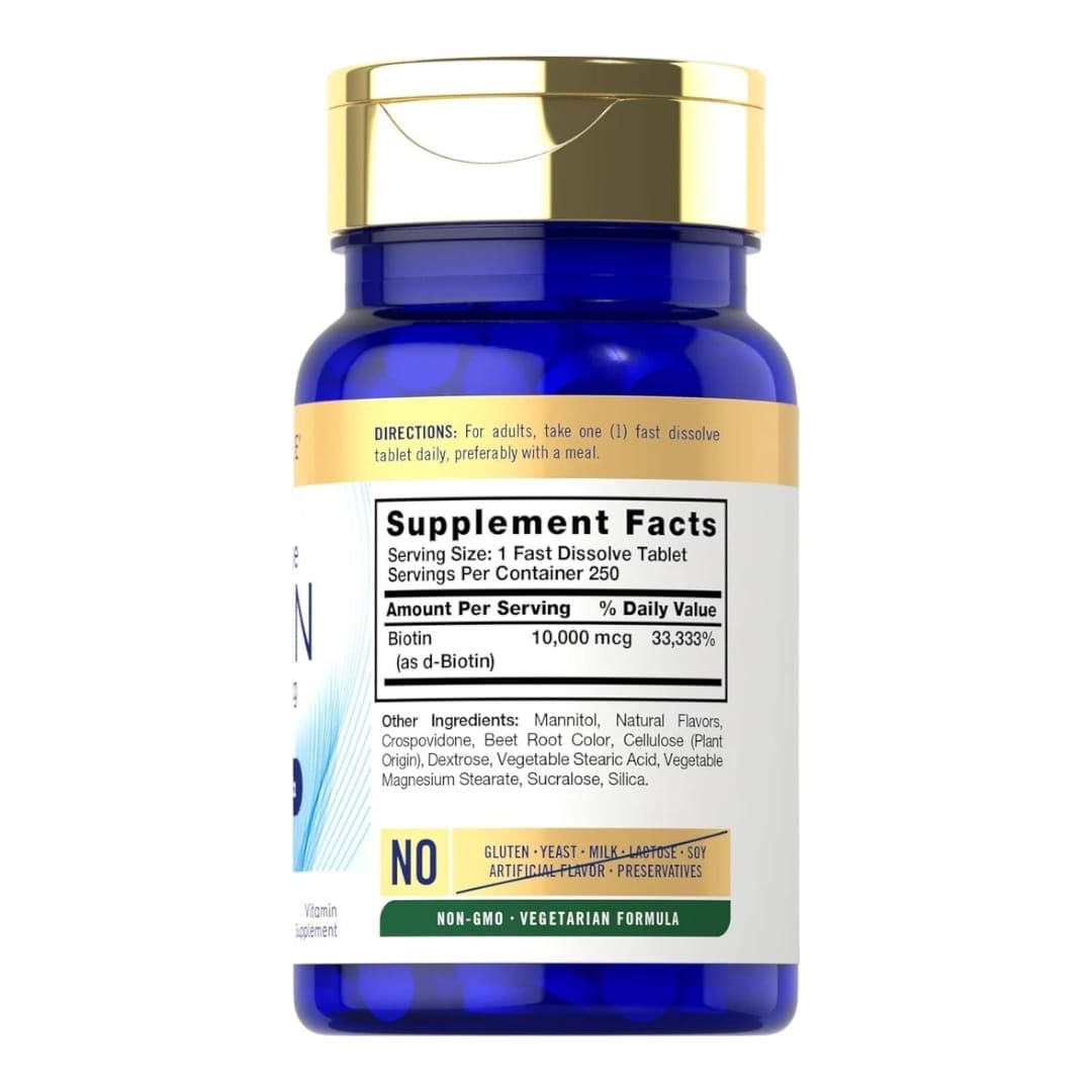 Carlyle Fast Dissolve Biotin 10,000 mcg tablets are crafted with the highest quality ingredients and have a delicious and natural berry flavor. Our superior biotin supplement is a non-GMO product that is packaged and lab tested for quality in the USA, and it is GMP certified. In addition, our high potency biotin is a vegetarian supplement free of common allergens, including gluten, lactose, milk, yeast, artificial flavor, and preservatives, making it the best money can buy!