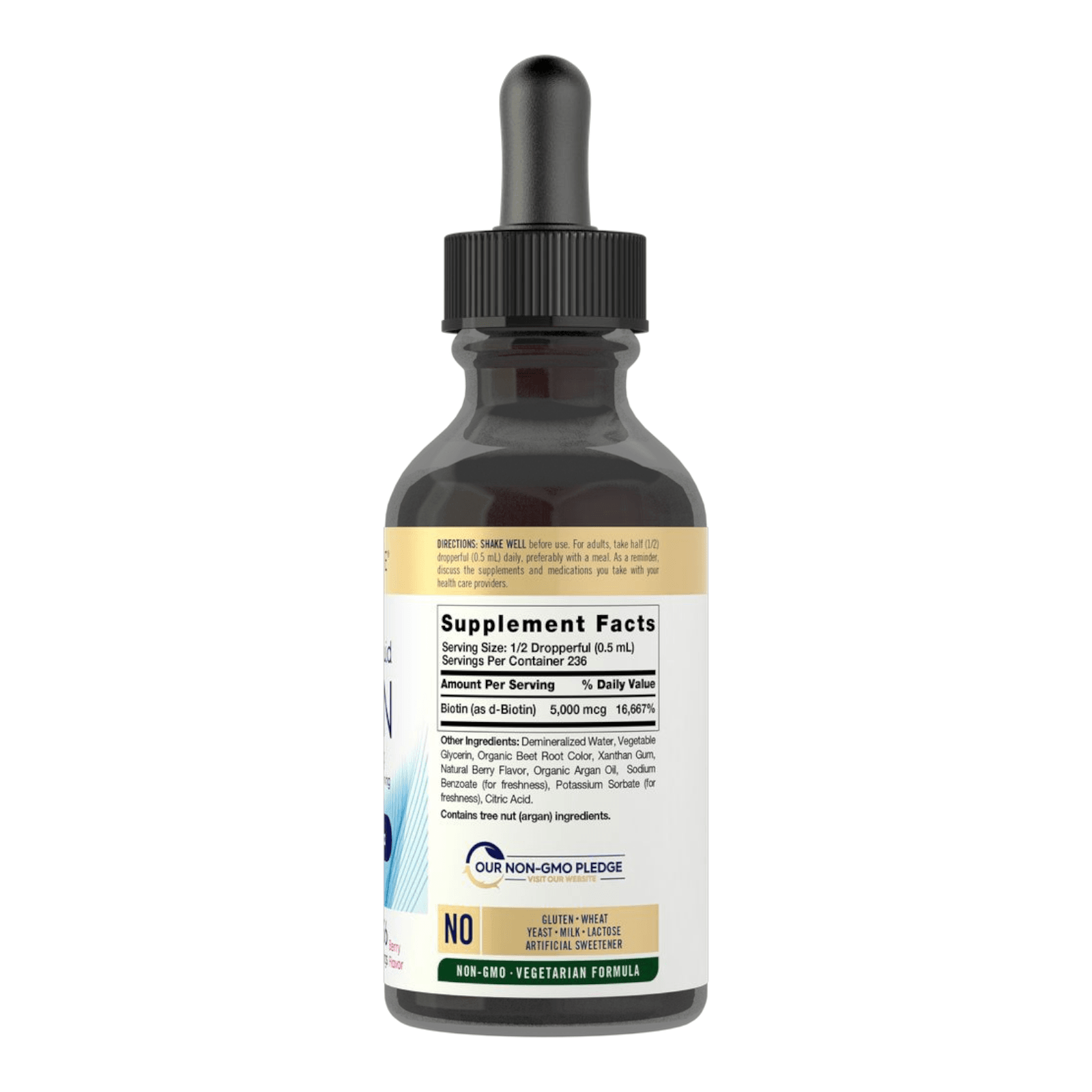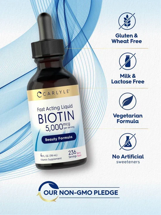 Carlyle Fast Acting Liquid Biotin is the best way boost your routine with this essential B-Vitamin! Our vegetarian formula delivers 5,000 mcg of Biotin per serving in berry flavor. It’s gluten free and non-GMO, making this supplement a top choice of Biotin for men and women everywhere!