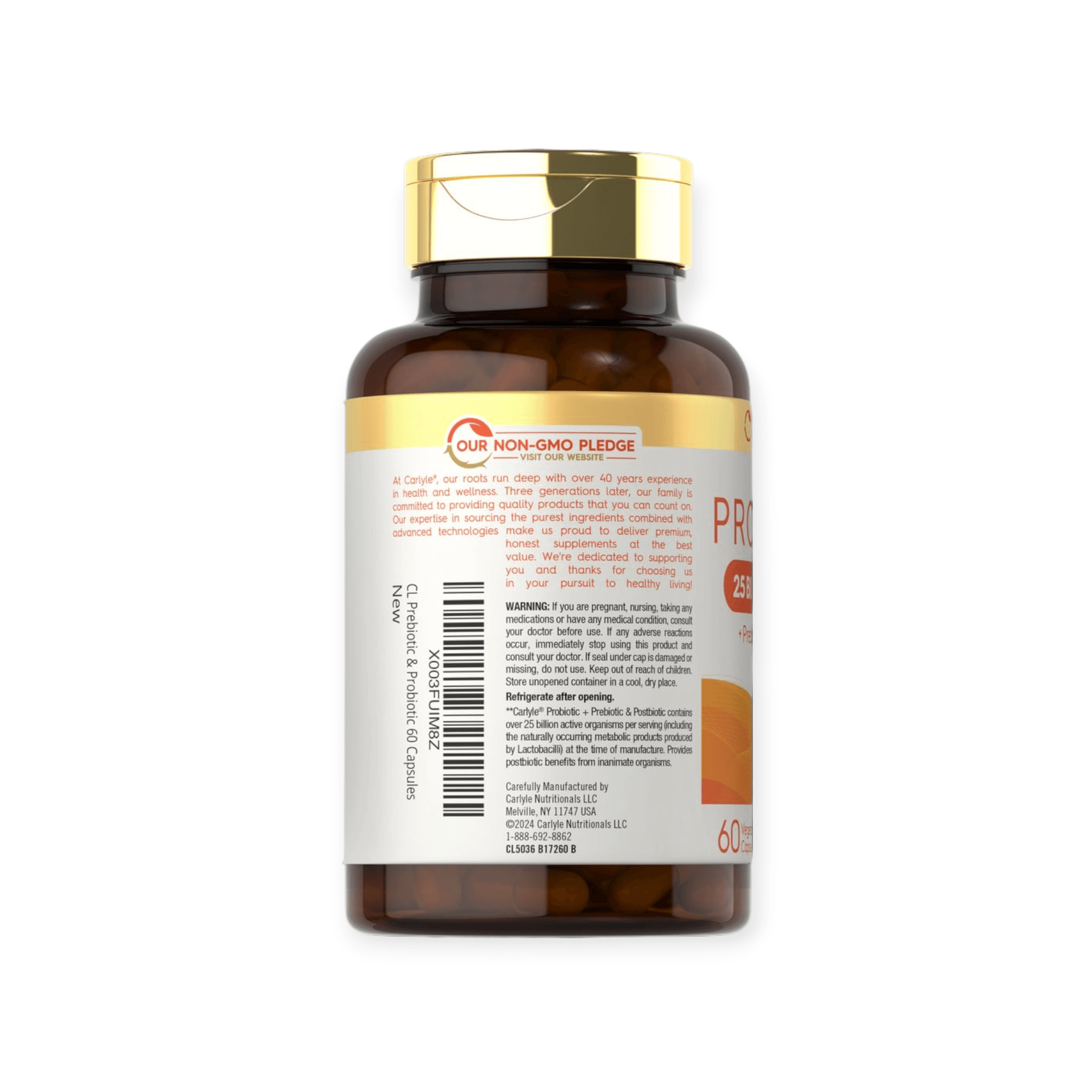 There are many supplement forms that feature beneficial bacteria. The most common include pills, bulk powders, chewable tablets, gummies, capsules, and more. Carlyle’s Probiotic + Prebiotic contains a Probiotic-14 Proprietary Blend which contains 25 Billion Active Organisms** per serving. Vegetarian capsules are gluten free and non-GMO, making it a great addition to your daily routine.