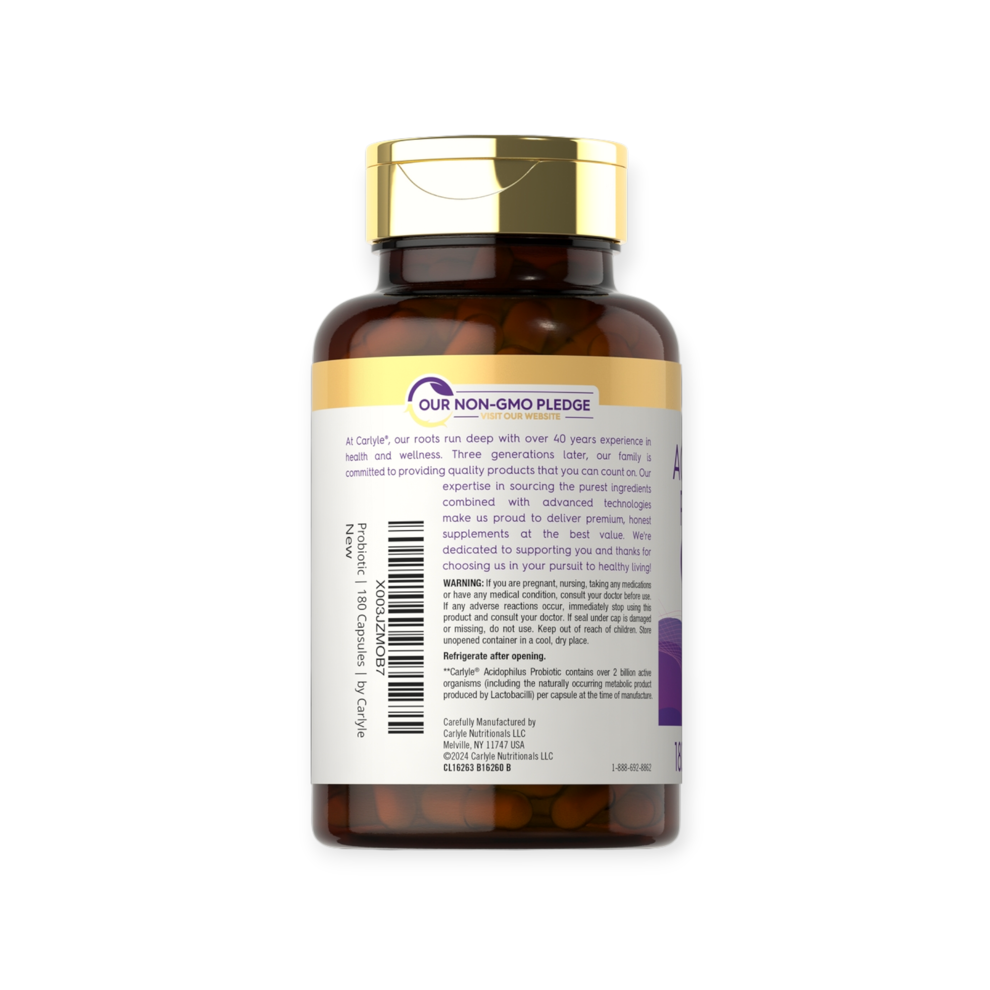 **Carlyle® Acidophilus Probiotic contains over 2 billion active organisms (including the naturally occurring metabolic products produced by Lactobacilli) per serving at the time of manufacture.