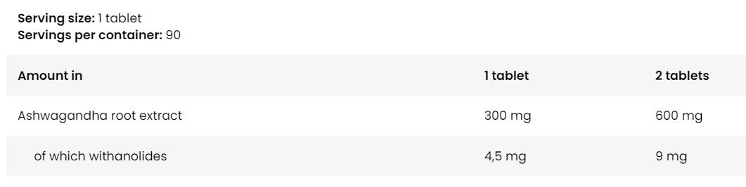 Ingredients: ashwagandha root extract (Withania somnifera L.; 1,5% withanolides), maltodextrin, anti-caking agents (E170, E470b, E551), bulking agent (E460(i)).
