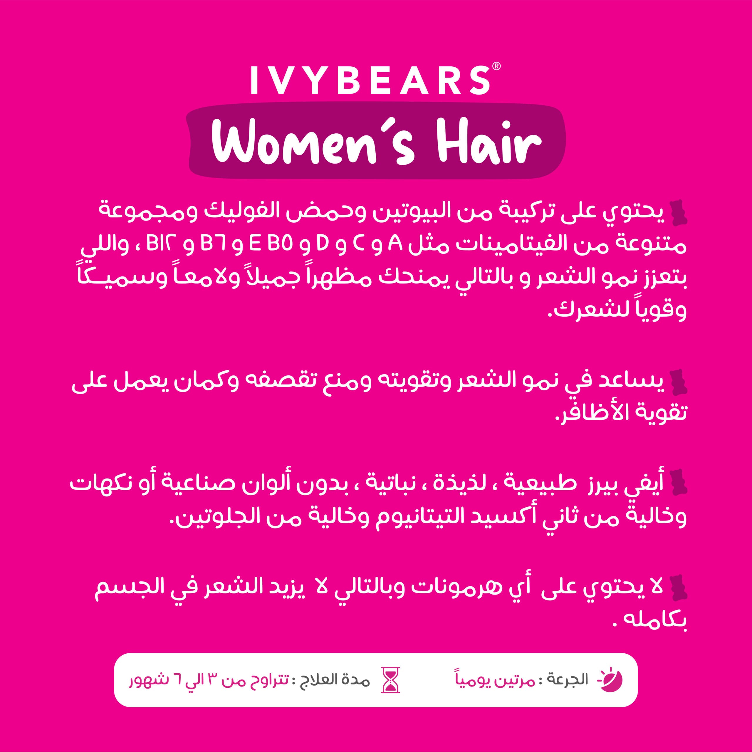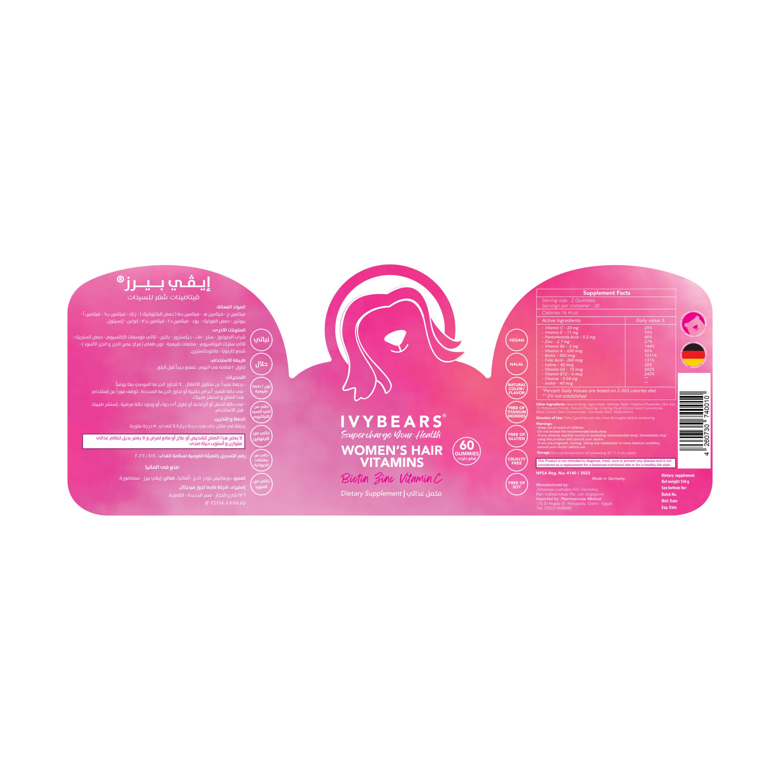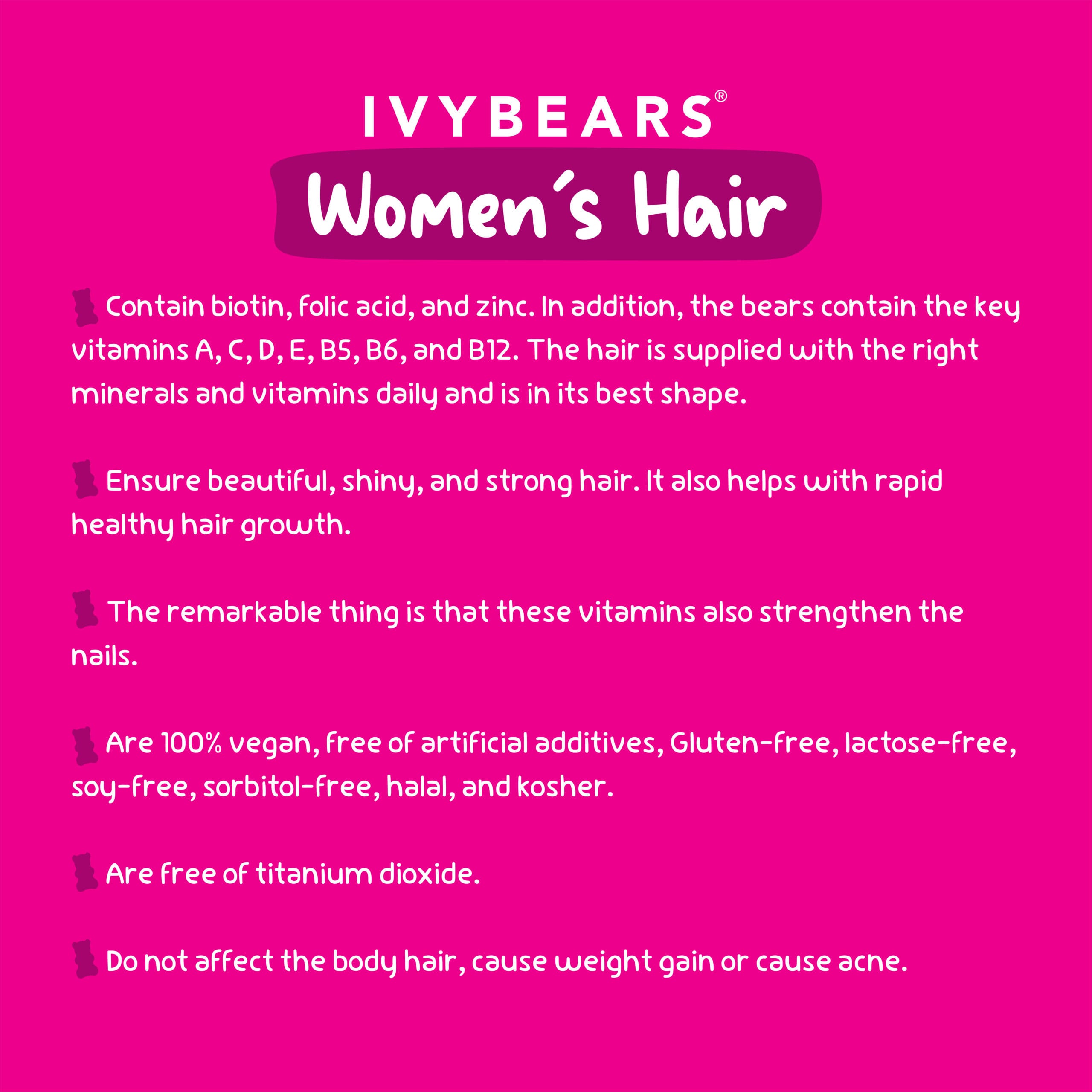 The complex formula of our vitamin bears is scientifically developed with hair and beauty experts to improve womenโs hair and is manufactured under strict controls in Germany.