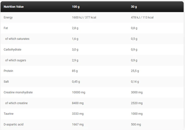 Ingredients: Whey protein isolate (from milk), creatine monohydrate, cocoa1, taurine, instant coffee9, cocoa7,8, D-aspartic acid, salt1,8,14, thickener (xanthan gum), anti-caking agent (E551), flavouring1,5,6,8, flavourings2,3,4,7,9,10,11,12,13,14,15, red beet juice concentrate3,10,11,15, colour/s [(E160a)2,4,6,12,13, (E150c)6, (E141)14, (E163)11], acidity regulator (citric acid)3,10,11,12, sweeteners (sucralose, acesulfame K).