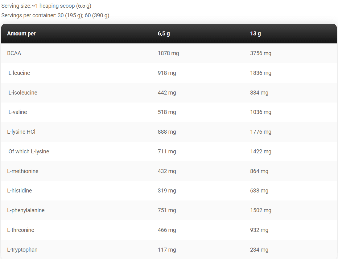 Recommended use: Mix ~1 serving (6,5 g) EAA with 250 ml cold water. As a food supplement consume 1-2 servings daily, one serving between meals and one serving before bedtime. On training days take 1 serving before, during or after your workout.