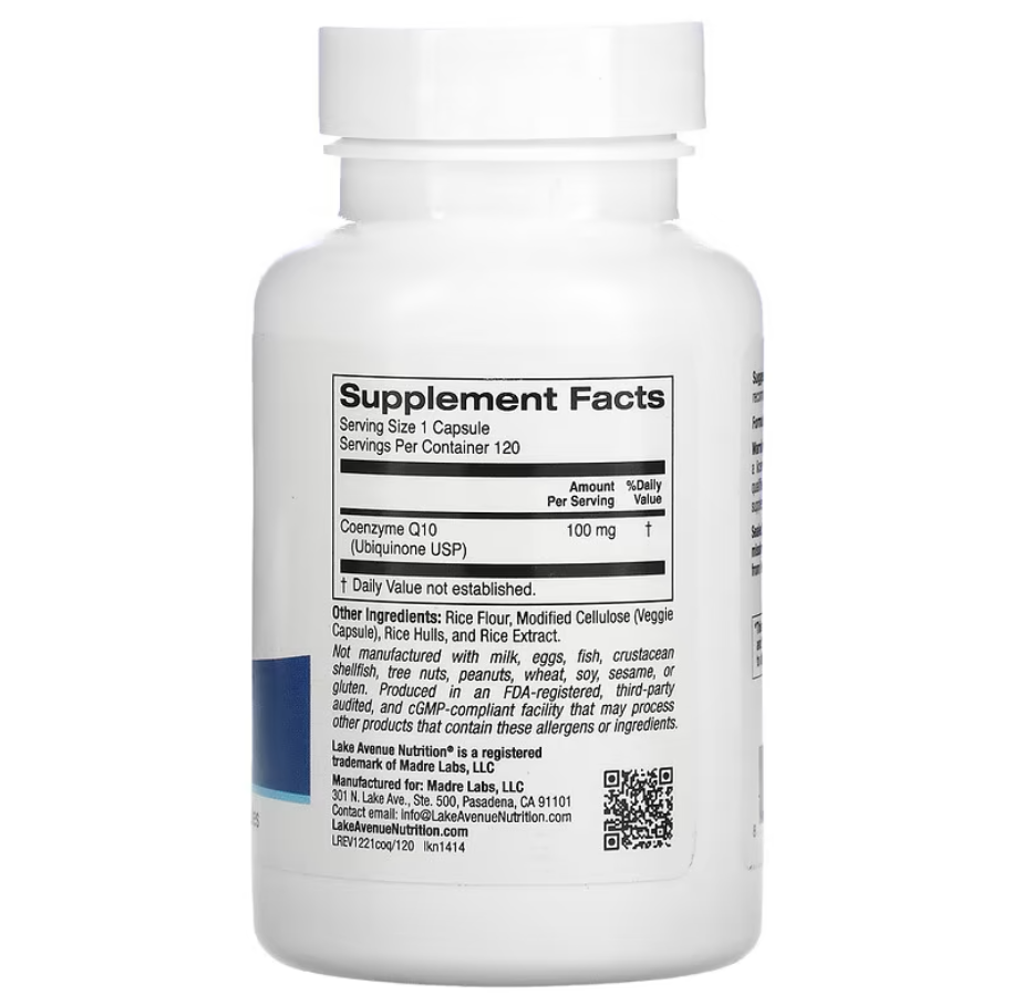 Lake Avenue Nutrition CoQ10 contains USP grade coenzyme Q10 in the form of ubiquinone. When taken as directed, this provides a four-month supply.