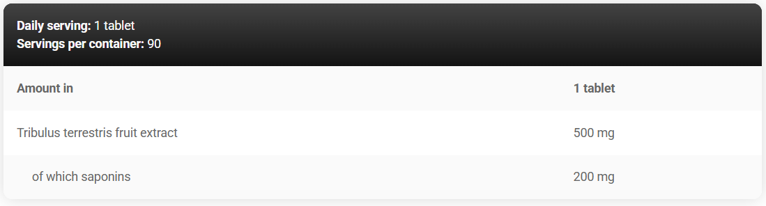Ingredients: anti-caking agents (E170, E470b, E551), tribulus terrestris fruit extract (Tribulus terrestris L.; 40% saponins), bulking agent (E460(i)), maltodextrin.