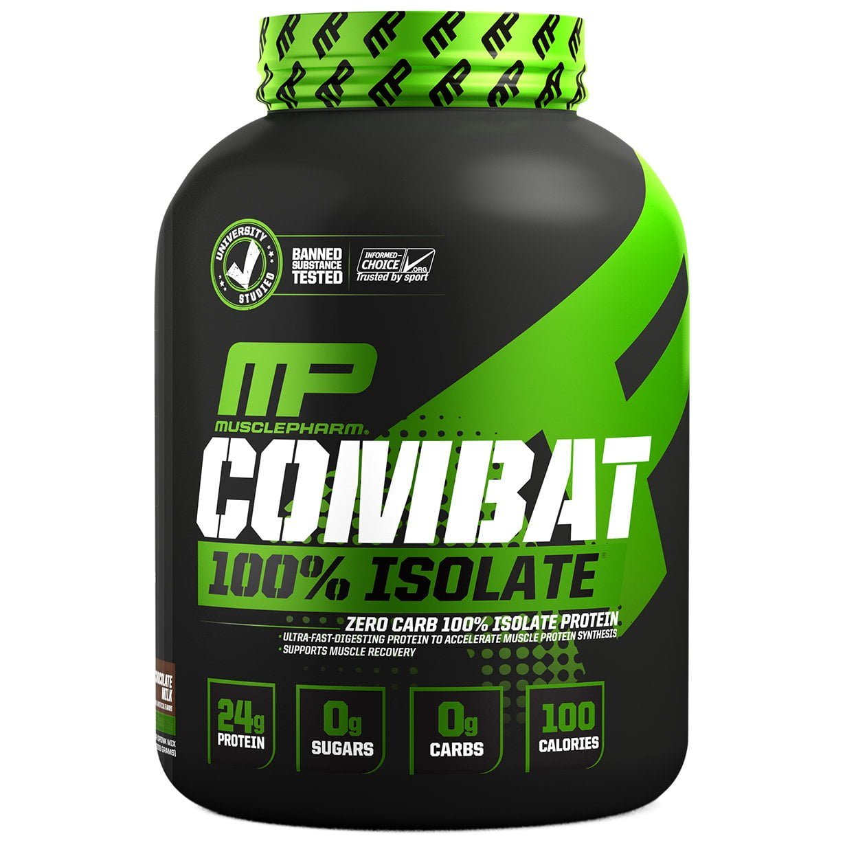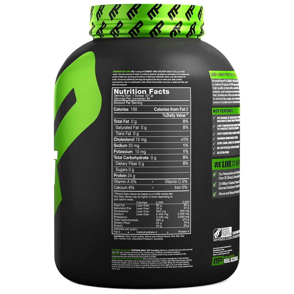 The absolute standard in whey isolate protein is cross-flow micro-filtered whey protein isolate. MusclePharm® uses its sophisticated process to produce Combat 100% Isolate™, the ultra-pure protein that beats our competitors in terms of packing more protein power while maintaining an optimal macronutrutient ratio. 24 grams protein, with zero grams sugar, zero grams carbohydrates and zero grams of fat (some variation dependent on flavor).