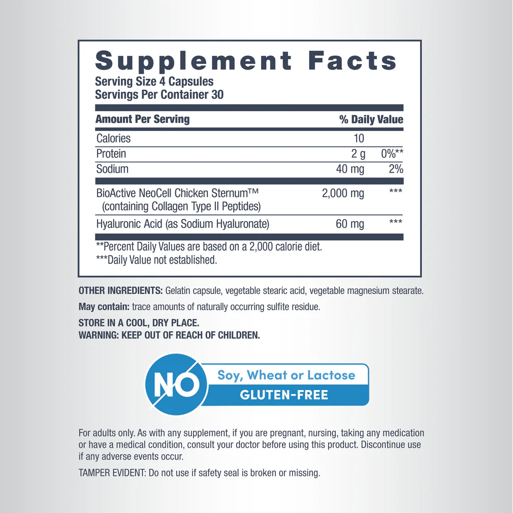 Each serving contains 2,000 mg of BioActive NeoCell Chicken Sternum™, which contains collagen type II peptides. Collagen type II is specifically concentrated in cartilage. As we age, natural collagen production levels begin to decline, which can impact cartilage and joints. Supplementing with a collagen source is a way to replenish the collagen levels to support the building blocks in the body.* Our collagen is also enzymatically simplified into peptide form, providing the body with smaller and more easily absorbed components.