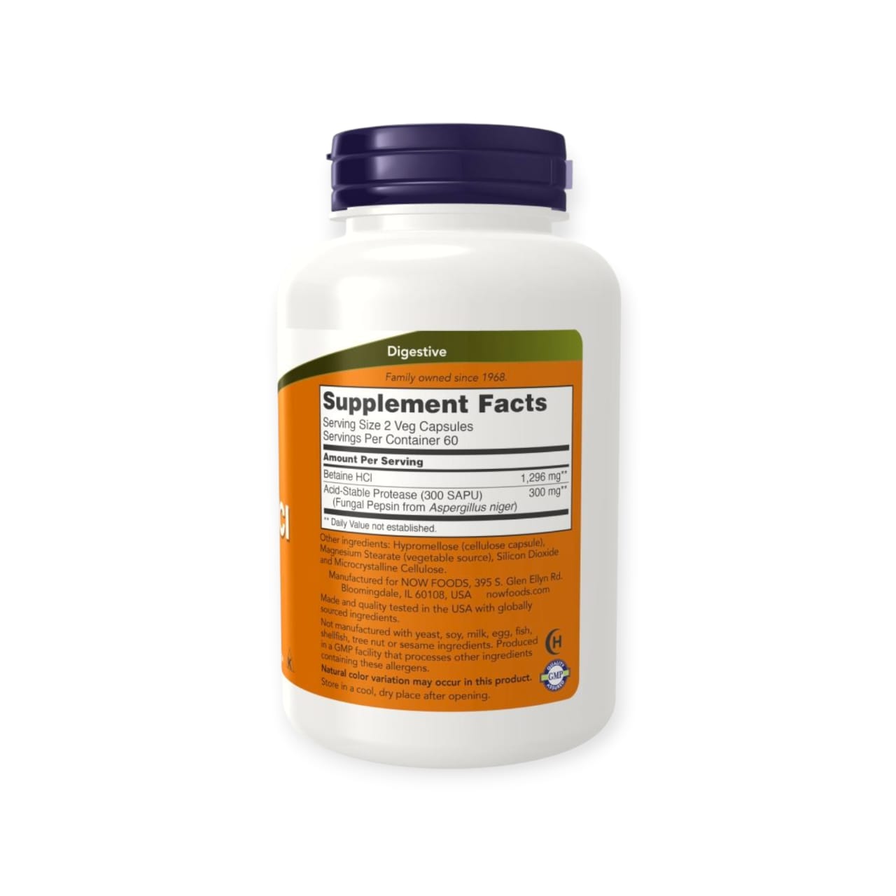 NOW® Betaine HCl is formulated to support proper digestive conditions in the stomach.* Hydrochloric acid (HCl) is normally produced in the stomach, where it assists protein digestion by activating pepsin, helps to maintain a healthy balance of gut flora, and stimulates the release of intestinal enzymes.* Pepsin is a protease produced in the stomach that partially breaks down proteins in foods.* HCl production tends to decline with age, so supplementing with HCl and pepsin may help to maintain normal digestive function.* This product uses a vegetarian acid-stable protease with activity equivalent to that of animal-derived pepsin.