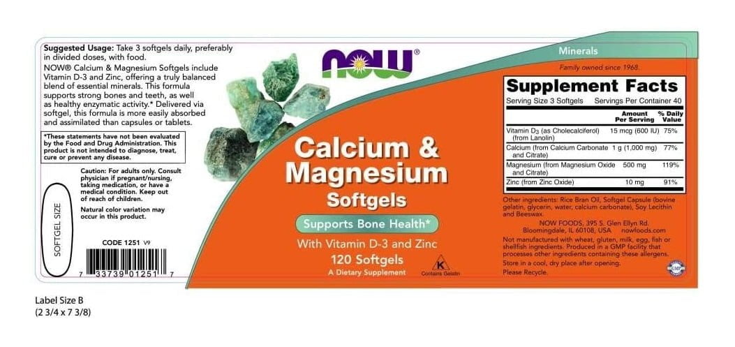 NOW® Calcium & Magnesium Softgels include Vitamin D-3 and zinc, offering a truly balanced blend of essential minerals. This formula supports strong bones and teeth, as well as healthy enzymatic activity. Delivered via softgel, this formula is more easily absorbed and assimilated than capsules or tablets.