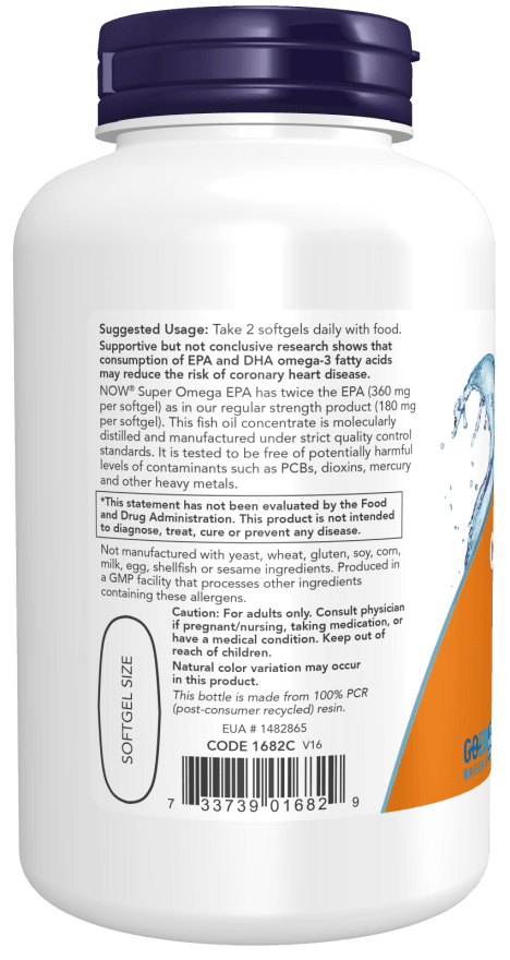 NOW® Super Omega EPA has twice the EPA (360 mg per softgel) as in our regular strength product (180 mg per softgel). This fish oil concentrate is molecularly distilled and manufactured under strict quality control standards. It is tested to be free of potentially harmful levels of contaminants such as PCBs, dioxins, mercury and other heavy metals.