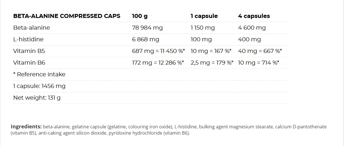 A combination of the amino acids beta-alanine and L-histidine, supplemented with vitamins B5 and B6. The product is sought after to reduce fatigue and exhaustion levels and support normal energy metabolism.