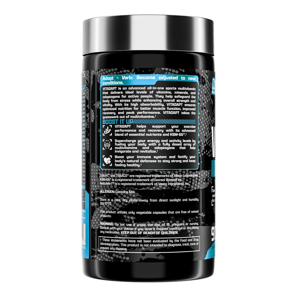 Stop wasting money on ineffective multis and start investing in an effective sports multivitamin. One that provides you, the hard-working athlete, with everything you need to support and increase performance, recovery, and muscle growth. Pick up a bottle of VITADAPT today.