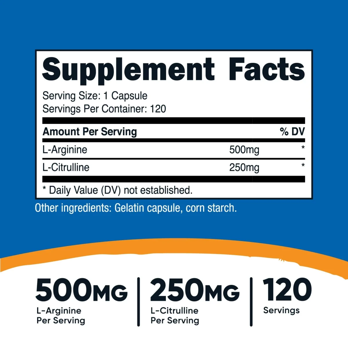 - 500/750mg of L-Arginine and L-Citrulline Complex Per Capsule