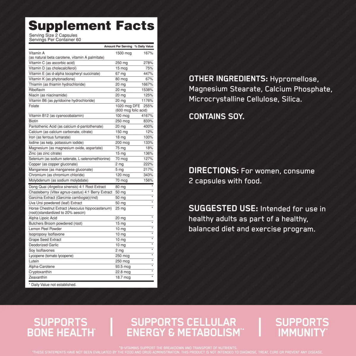 OPTI-WOMEN® is more than a multi. It’s a Nutrient Optimization System providing 40 active ingredients including 23 vitamins and minerals designed to support the nutrient needs of active women. Each 2-capsule serving delivers wide-reaching nutrient support in Vegetarian Society approved Vcaps.