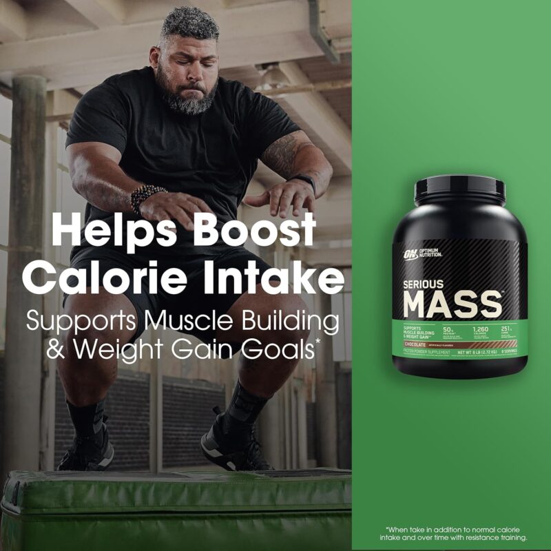 OPTIMUM NUTRITION Serious Mass powder supports muscle building, weight gain, and helps fuel workouts with up to 1260 calories, 50g of protein, up to 253g of carbohydrates, and 5g of creatine monohydrate in every serving 1,7– all in a convenient shake for easy consumption.