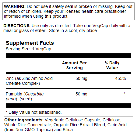 Solaray Zinc Amino Acid Chelate provides 50 mg of zinc which has been bonded to amino acids for better absorption and utilization. Combined with aspartic acid, glycine, whole rice concentrate and citric acid to create a chelated complex, our formula is intended to be gentler on the stomach and easier to assimilate. And for powerful sun-grown nutrition, pumpkin seeds are also added as a source of naturally occurring zinc. Trust Solaray Zinc 50 to help you Live a Little Brighter!