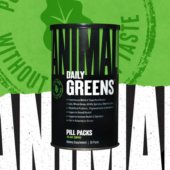 Empower your body’s immunity, digestion, and overall wellness with our Animal Greens pack. This nutrient-rich supplement delivers a daily serving of greens in a convenient pill pack, offering an optimal blend of vegetables, prebiotics, and greens without the unpleasant aftertaste often associated with powdered alternatives.