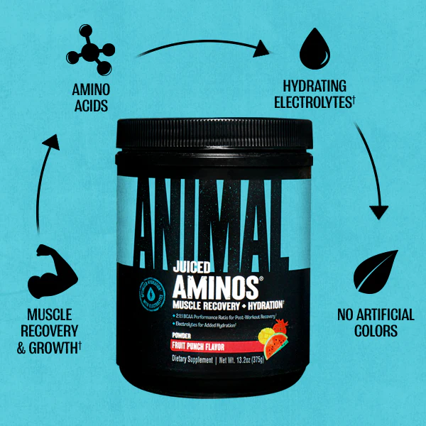 Animal Juiced Aminos is a powerful essential amino acid supplement formulated to boost training performance and speed up recovery and is ideal for intra and post workout support. With Animal Juiced Aminos you get a full, comprehensive EAA profile designed to deliver the correct ratios of key essential amino acids supporting increased muscle protein synthesis and decreased muscle protein breakdown– our unique amino acid formula utilizes an anabolic BCAA (2:1:1 ratio) and EAA matrix that promotes fast recovery times.