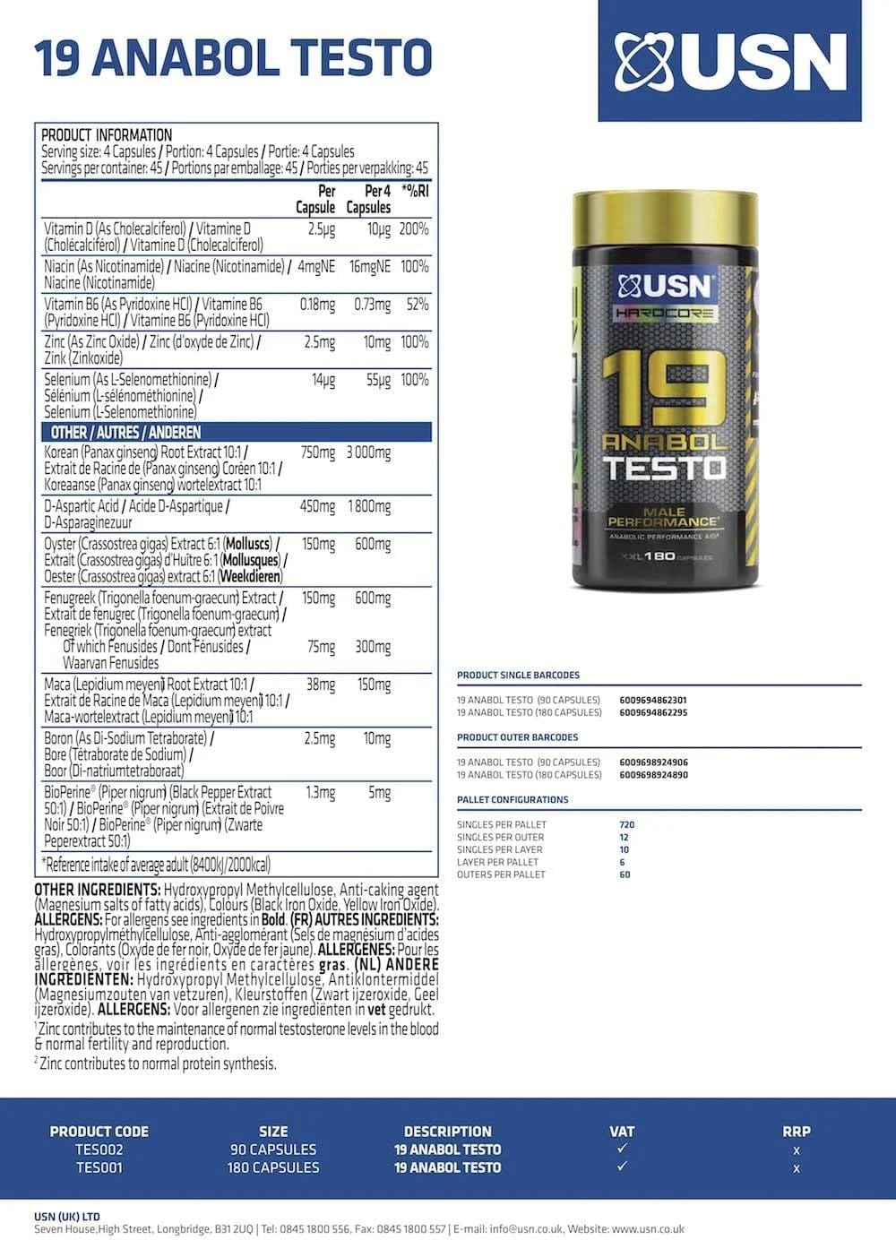 Give your testosterone levels a boost with USN 19-Anabol Testo. The added blend of zinc, magnesium and vitamin B6 also supports metabolism and reduces fatigue, which boosts physical performance.