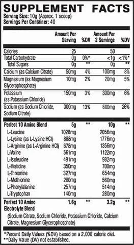 XTEND® Perfect 10 is formulated to mimic the essential amino acid (EAA) ratio found in human skeletal muscle tissue. This means XTEND® Perfect 10 Amino Delivers EAAs that are perfectly engineered to support recovery and repair. XTEND® Perfect 10 Amino also contains a blend of four critical electrolytes engineered together to match the approximate rate and ratio of key minerals lost in sweat during high-intensity training.